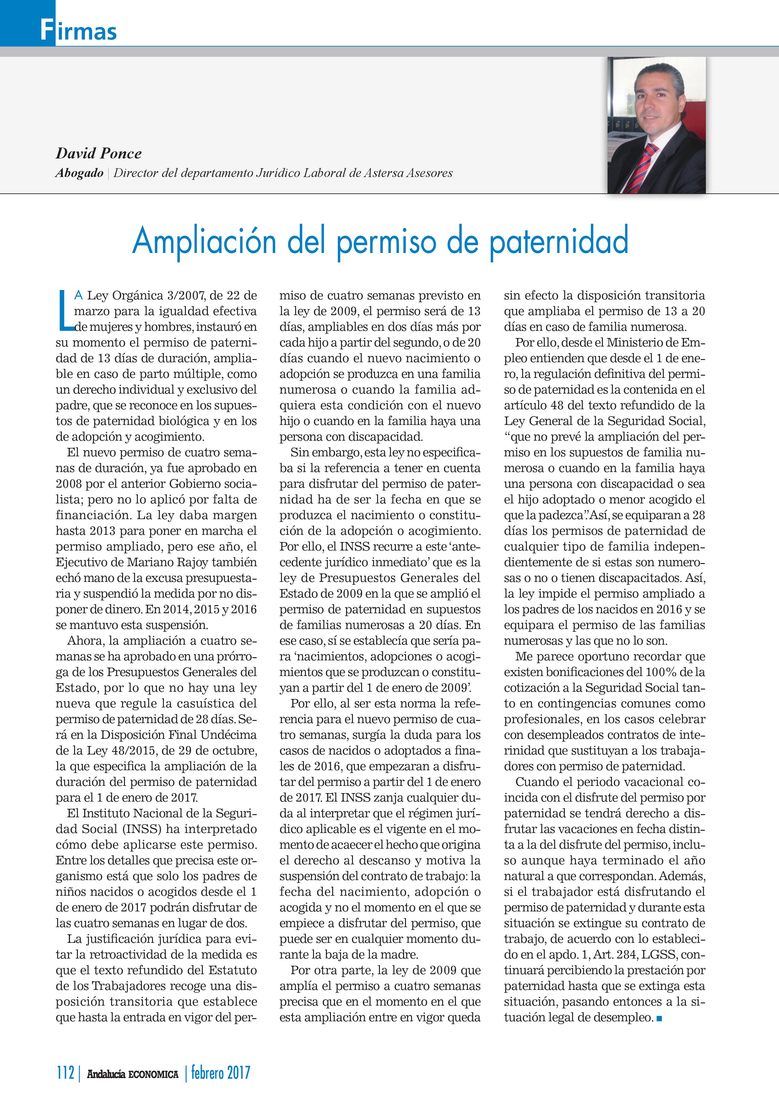 El director del departamento jurídico-laboral David Ponce ha vuelto a publicar en la revista Andalucía económica esta vez tratando los permisos de paternidad